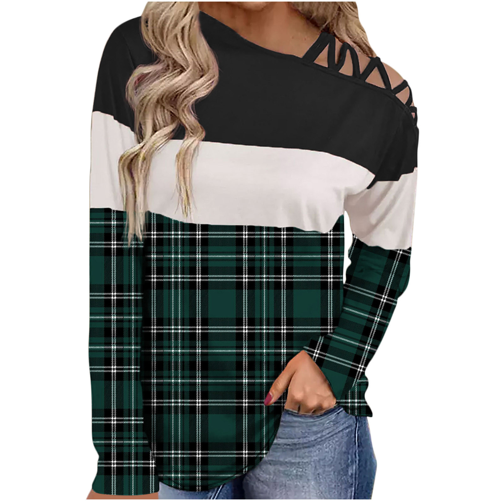 Cobkk Womens Tops Office Off The Shoulder Blouses Shirts Women Long Sleeves Shoulder Off Shoulder Cross Strap Plaid Color Block Tops Blouse Tunic Tops Green Sports Lounge Fit Versatile Tops Walmart Com